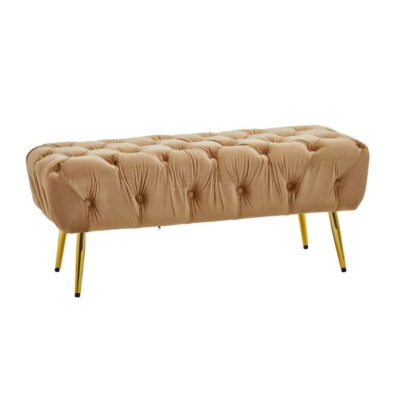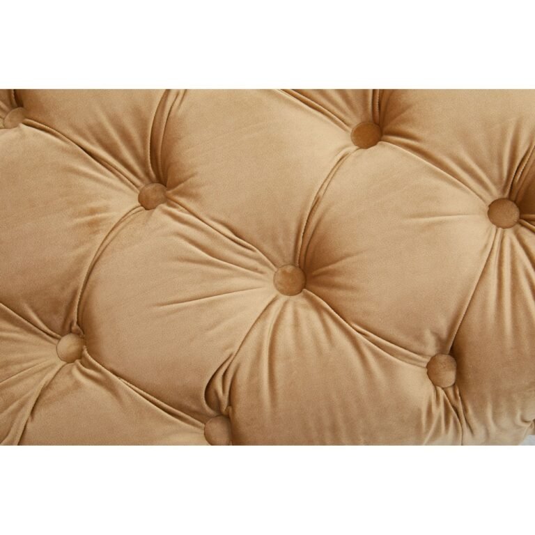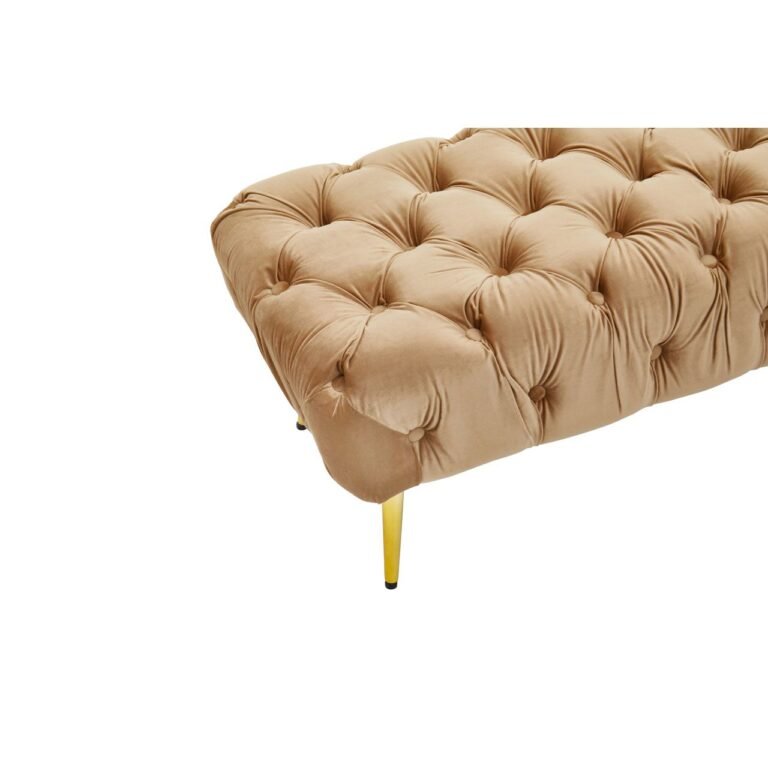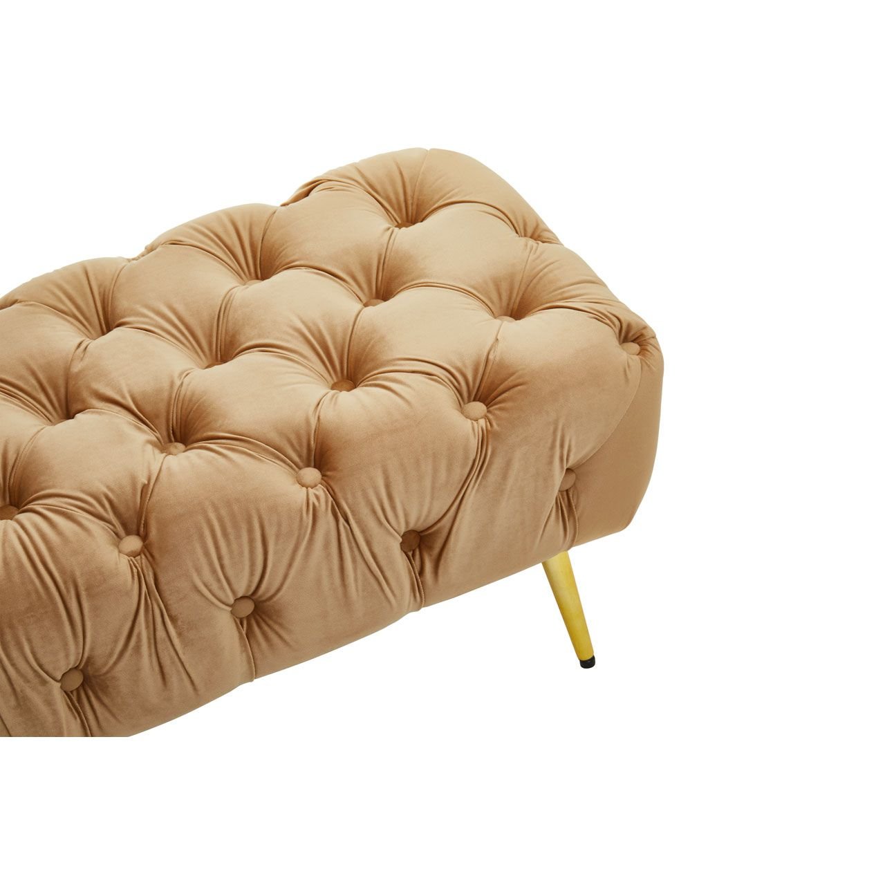 Upholstered in plush and luxurious beige velvet, this Sierit Gold Leg Footstool has a comfortable seat in dense button tufting that lends it depth and texture. The gold finish tapered metal legs complement the smooth velvet and contribute to the overall glam appearance.