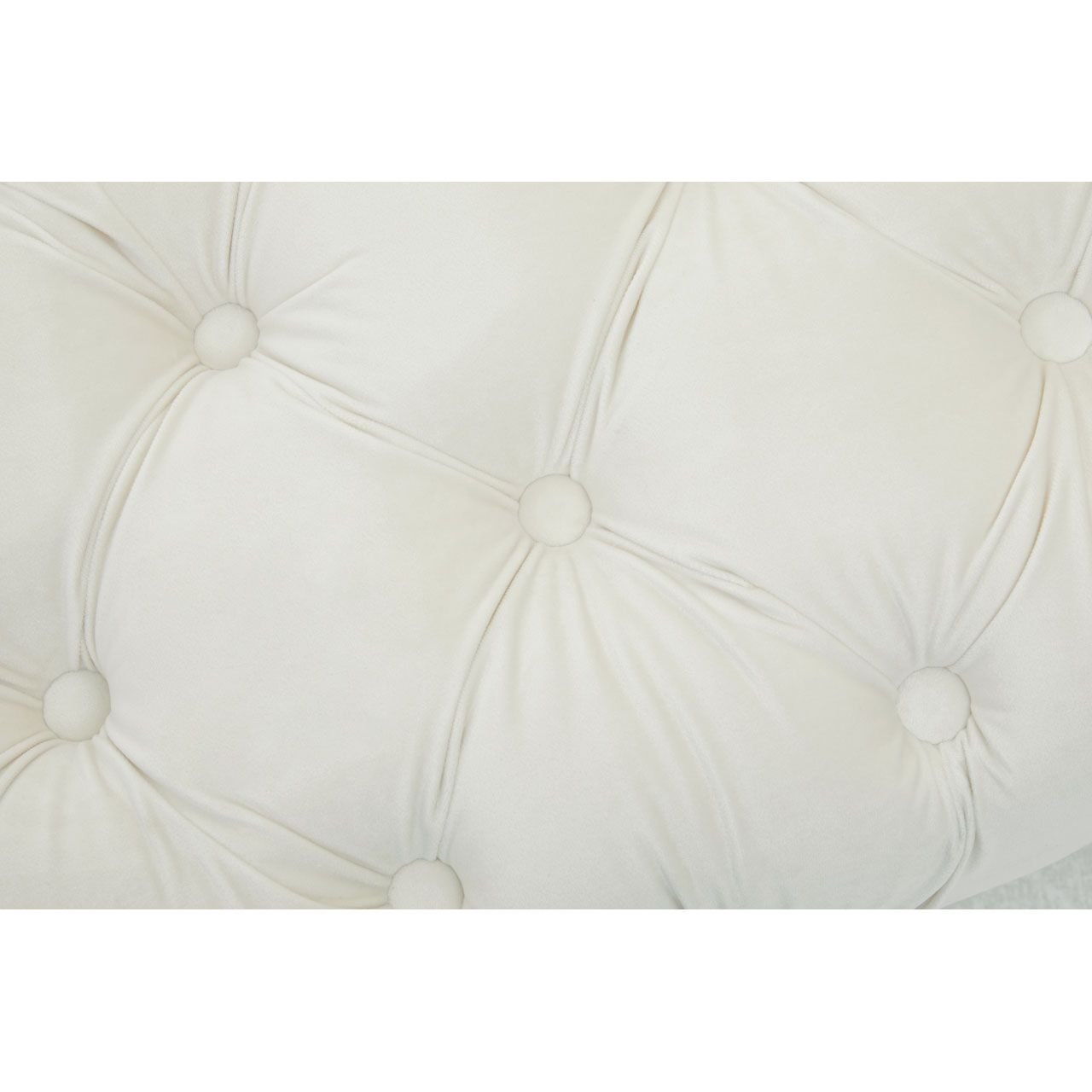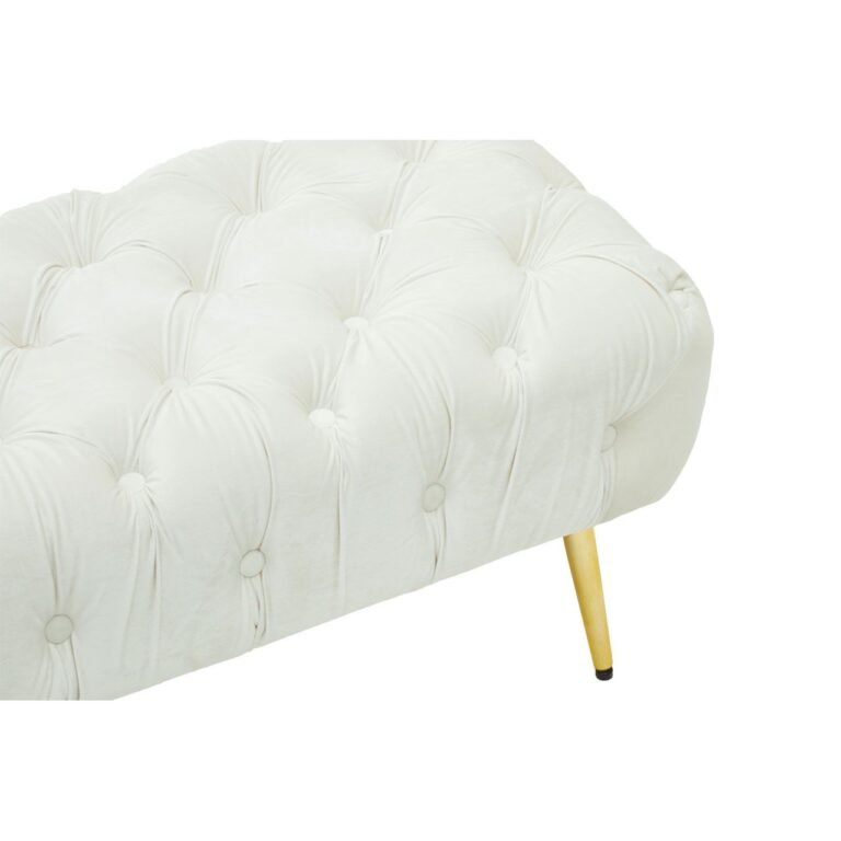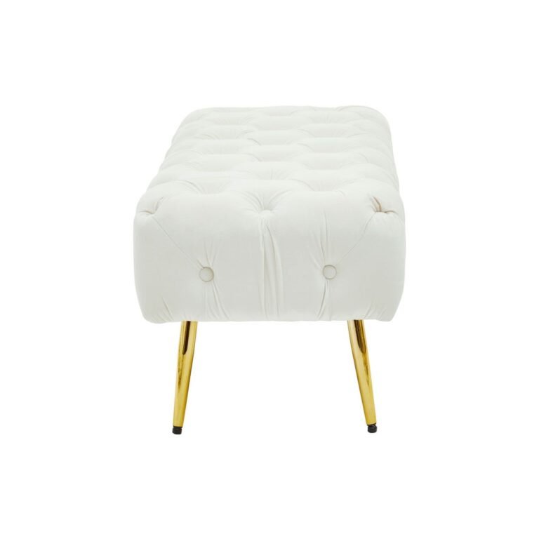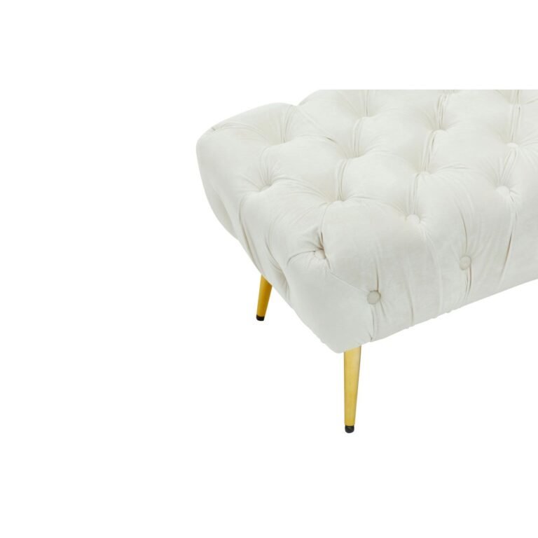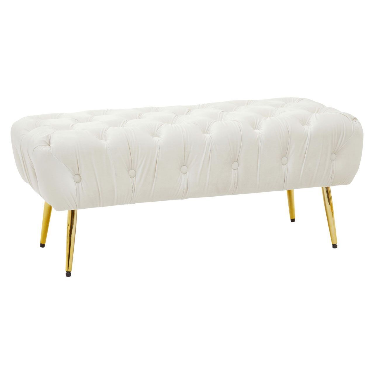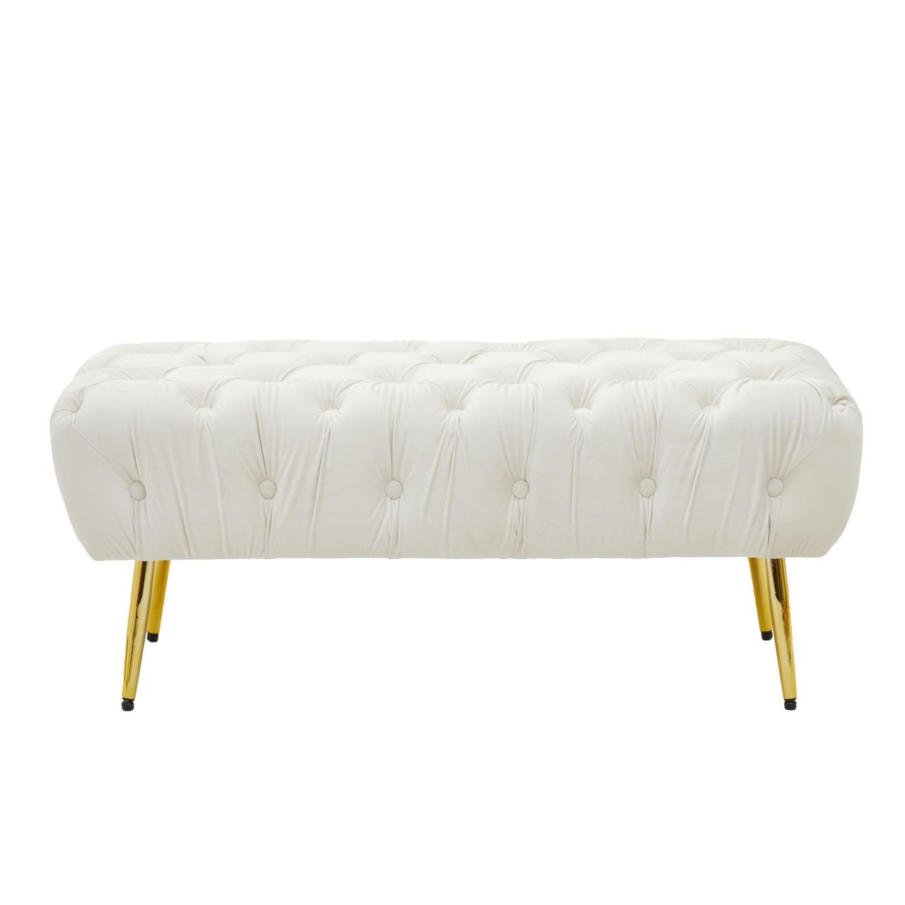 Upholstered in plush and luxurious cream velvet, this Sierit Gold Leg Footstool has a comfortable seat in dense button tufting that lends it depth and texture. The gold finish tapered metal legs complement the smooth velvet and contribute to the overall glam appearance.