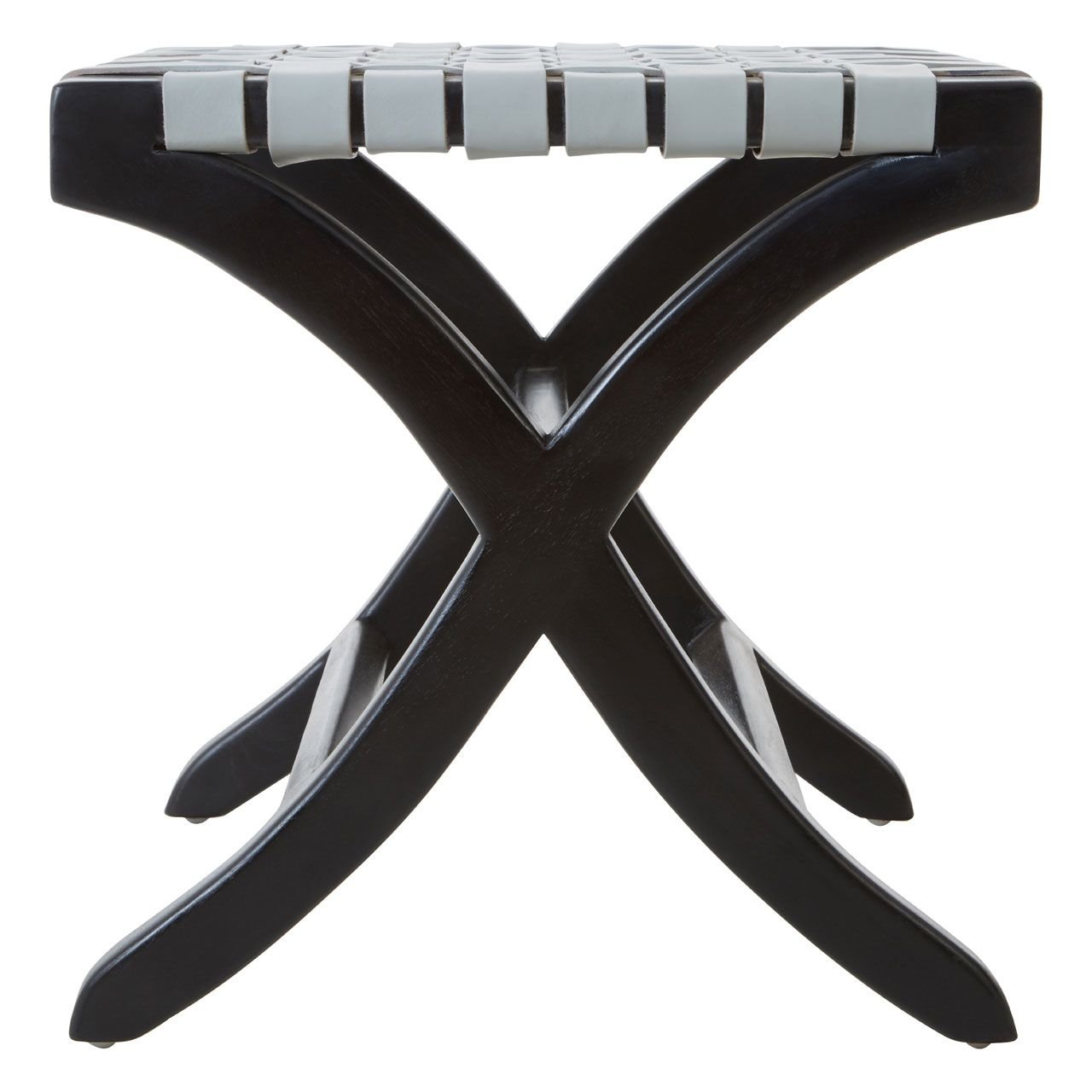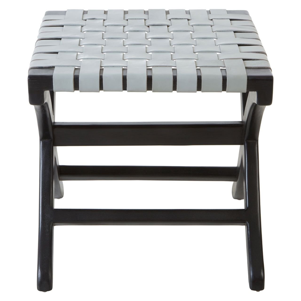 Stirling Grey Stool sweeping legs are crafted from eco-friendly teak wood and have a sleek black finish. Straps of genuine cow leather form a lattice pattern across its top, creating a comfortable place to sit. Part of the Stirling collection, this stylish stool can be styled with boho-inspired furniture and accessories.