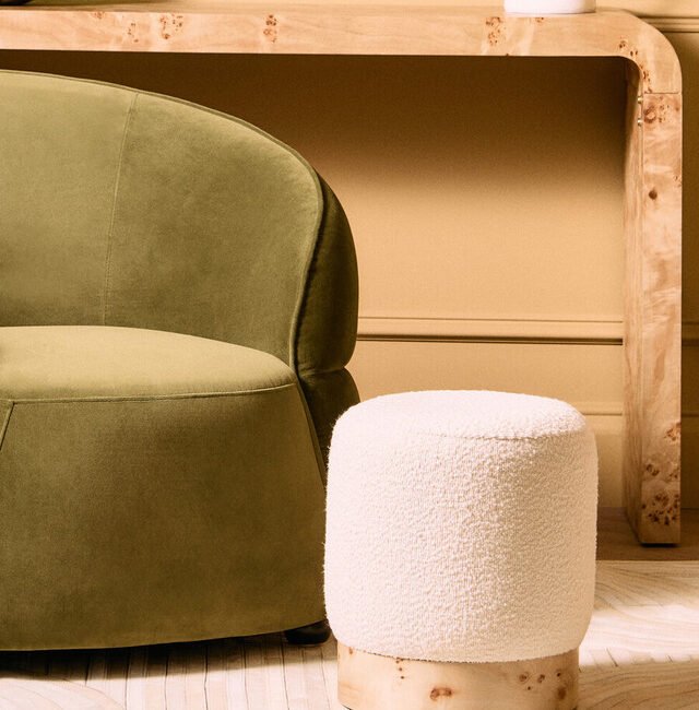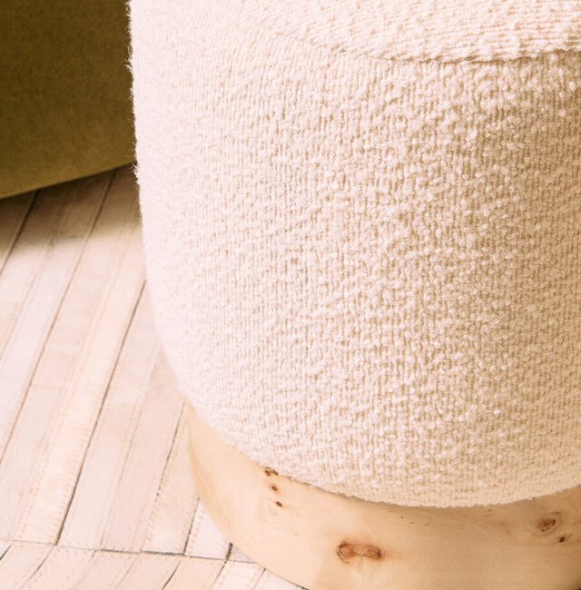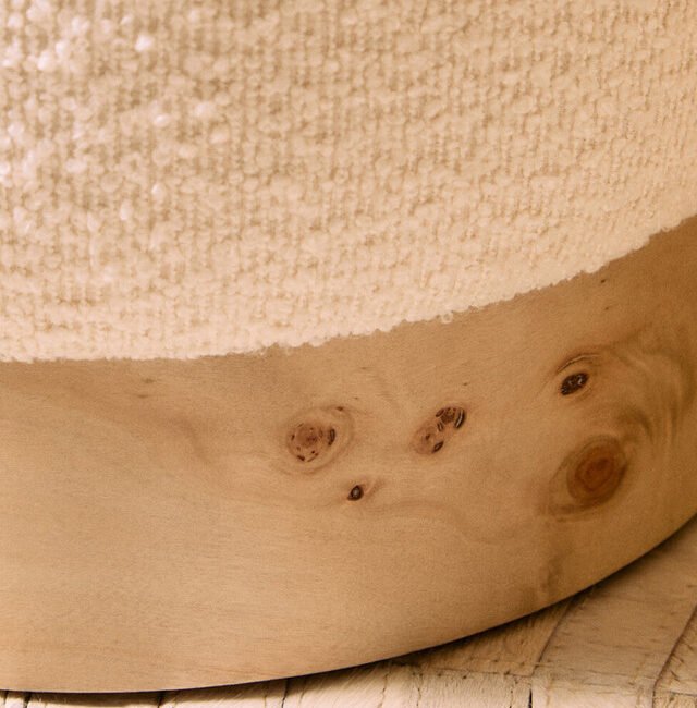 Atom Burl Wood And Cream Boucle Stool: The Mota burl wood and cream boucle fabric stool combines stylish boucle fabric with a sturdy burl wood design base for a modern organic look. Its seamless design offers a chic touch of texture and warmth. Ideal as an accent piece or extra seating, it blends durability with refined style.