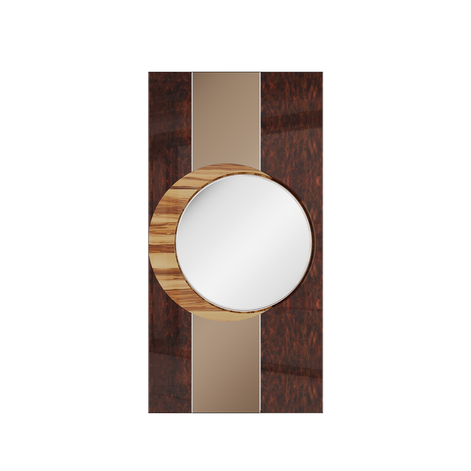Body in Marquetry Gloss Walnut Root Wood Veneer; Olive Tree; Glass Mirror; Bronze Mirror;
