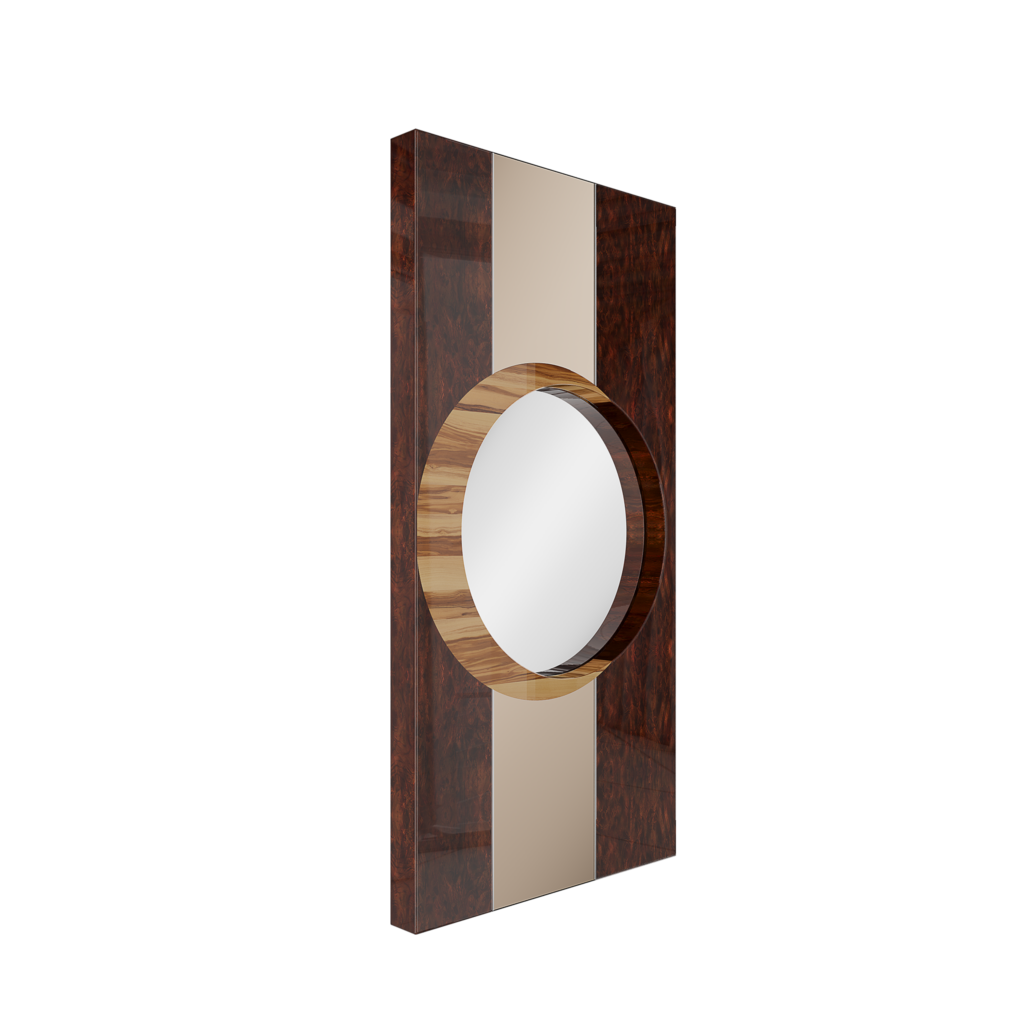 The Elyse Mirror is a modern rectangular wall mirror designed to stand out in any unique interior design project. A big rectangular wood frame with a round mirror at its center, this piece showcases a harmonious blend of rich wood tones arranged in an intricate geometric marquetry pattern. This design infuses the mirror with mid-century modern flair, making it an ideal addition to contemporary interiors.