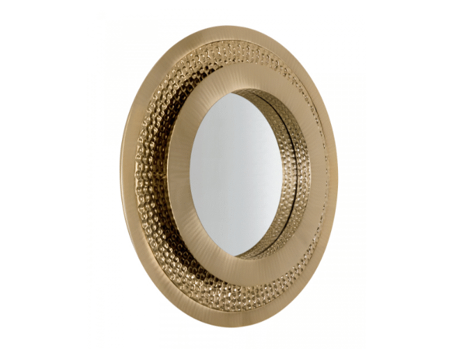 The polished brass promotes a sense of luxury, the circuler hammered shape demonstrates the handmade work this piece carries. This design is a living tribute to the legend itself as the 24k standard gold finish allows a unique reflection that distinguishes this mirror from all the others. This golden mirror can be perfectly used in various interior solutions such as: Entrance mirror, wall mirror, bathroom mirror or bedroom mirror.
