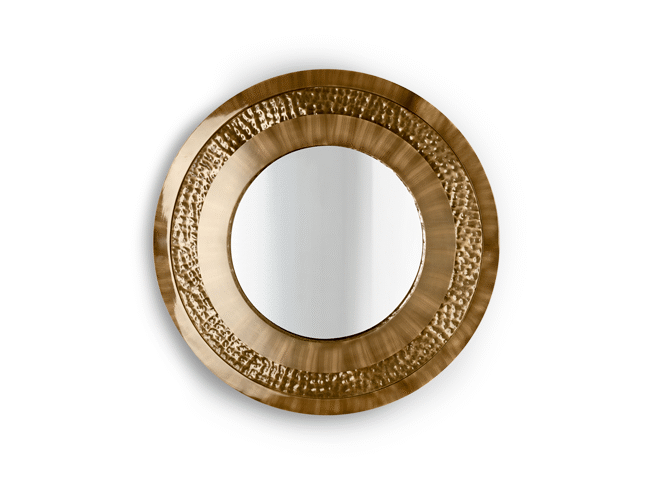Golden Eye Mirror: Surrender to the beauty of this meticulously designed mirror. This elegant decorative piece brings a powerful evocation of the sublime as its inspiration came from the epic “Golden Eye” movie from the James Bond series. The combination of polished and hammered finishes allows a magnificent effect that evokes the opening scene of the movie.