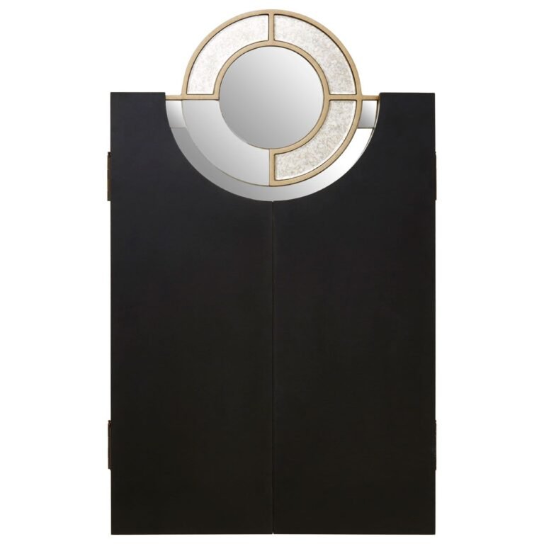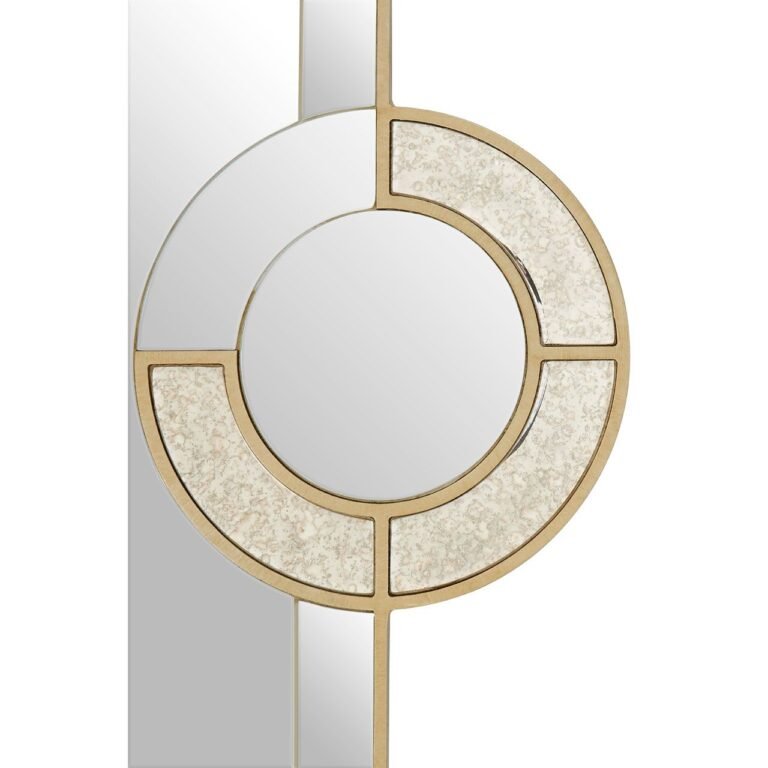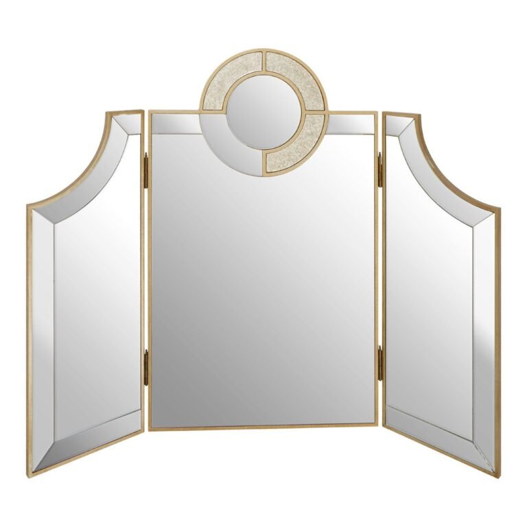 This Alnwick Dressing Table Mirror features three panels, with hinged sides that allow the viewing position to be adjusted. It features a metallic champagne coloured trim which is slightly distressed, and a large circle motif with patinated detail. The glass boasts bevelled lines that accentuate the mirror’s curves.