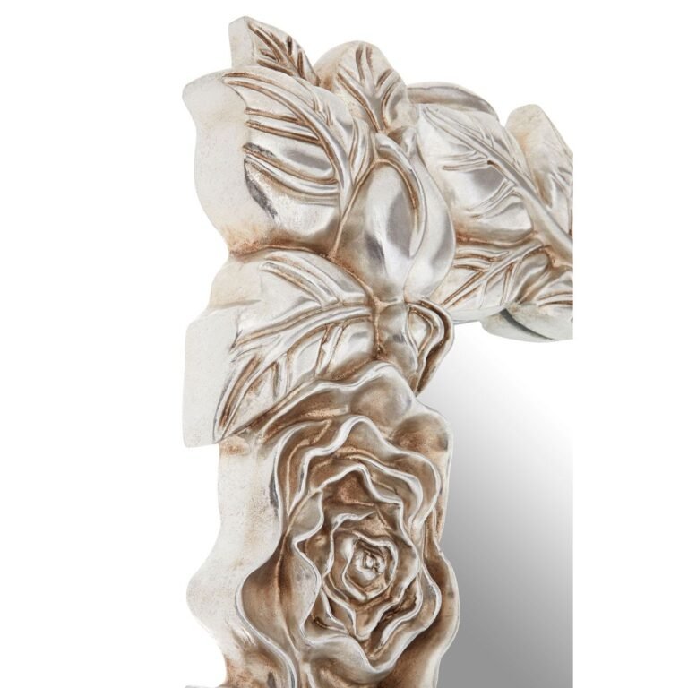 The frame of the Atherstone Champagne Rose / Leaf Wall Mirror is garlanded by a series of leaf motifs, with budding and full flower shapes woven into their curving forms. They encroach slightly upon the mirror’s reflective surface, breaking up the rectangular lines. The champagne coloured frame has a distressed finish that gives the mirror its antique look.