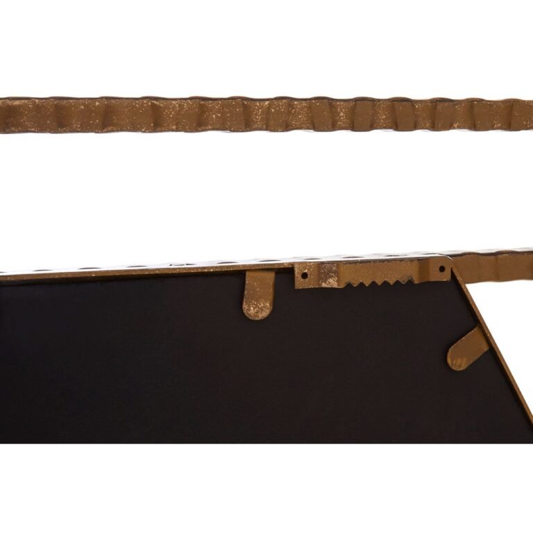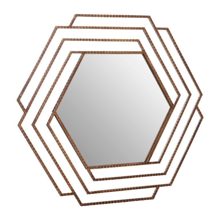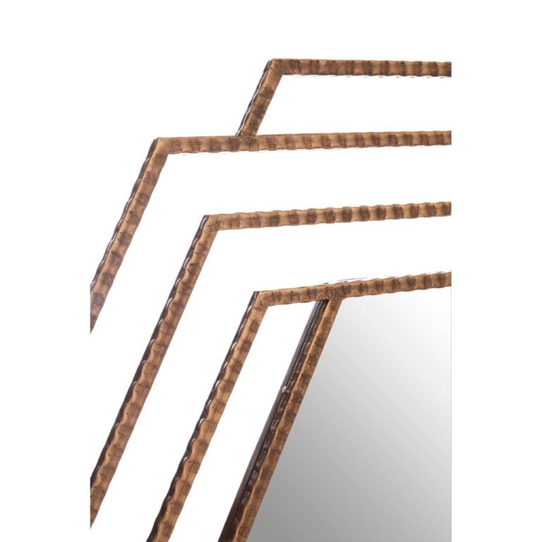 This Aullie Antique Gold Finish Wall Mirror features a textured iron frame in a warm metallic finish that adds to its retro vibe. The hexagonal layers contribute to its stylish aesthetic and make this mirror a distinctive geometric accent piece. Their minimalism and symmetric overlapping create a distinctive design and give it a striking visual appeal.