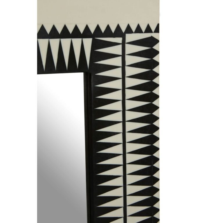 The Borough Wall Mirror frame is decorated by a geometric, tribal-style pattern comprised of slender black and white triangles.