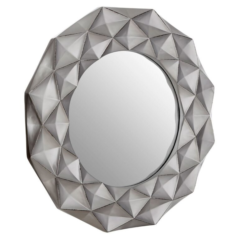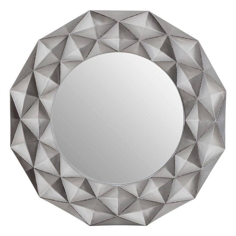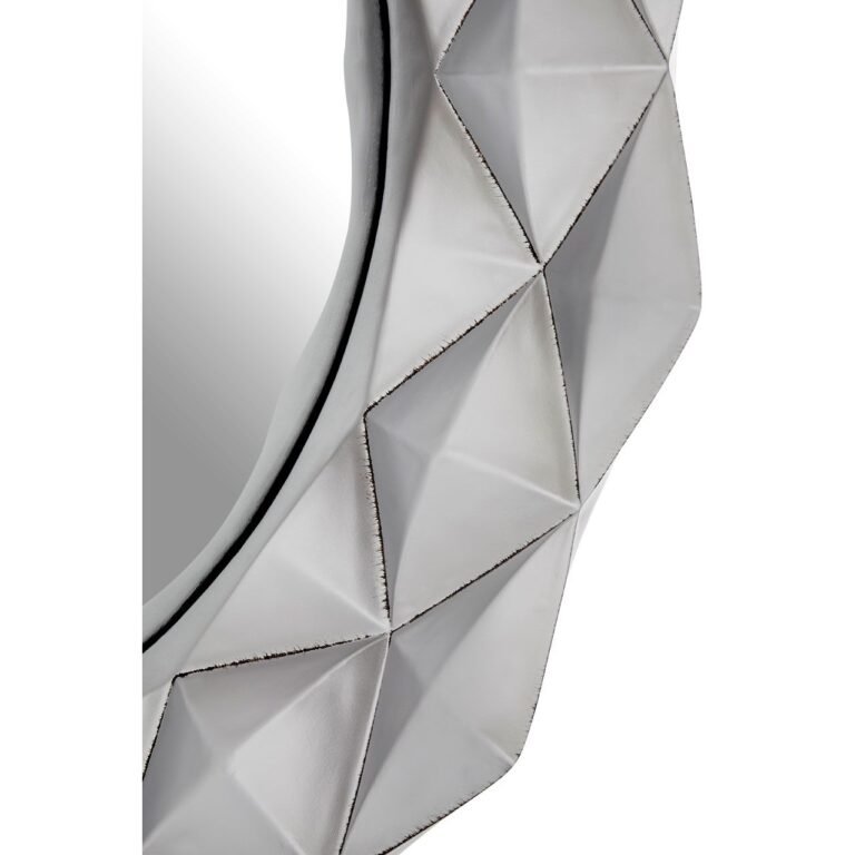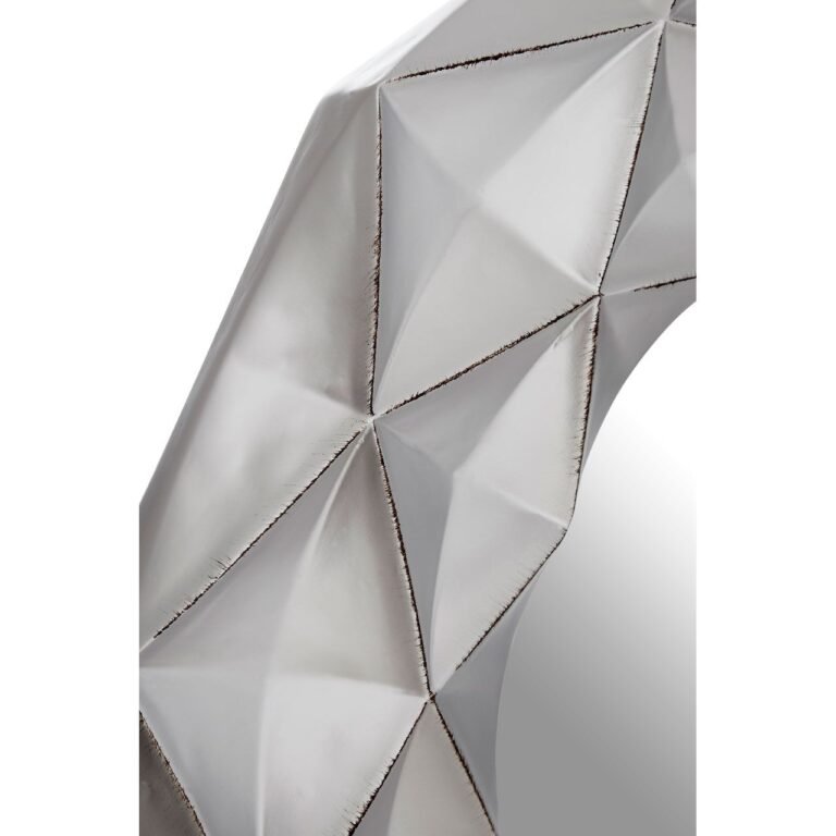 The Dunhill 3D Effect Light Silver Wall Mirror’s distinctive frame is comprised of a series of triangular forms that rise and fall. This creates a 3D effect that contributes to this large mirror’s presence. The circular mirror is slightly inset to the frame, the latter’s silver finish making it suited to styling with dark wood furniture.