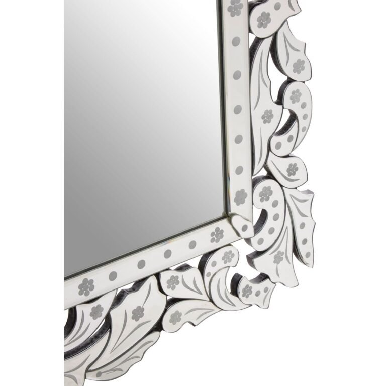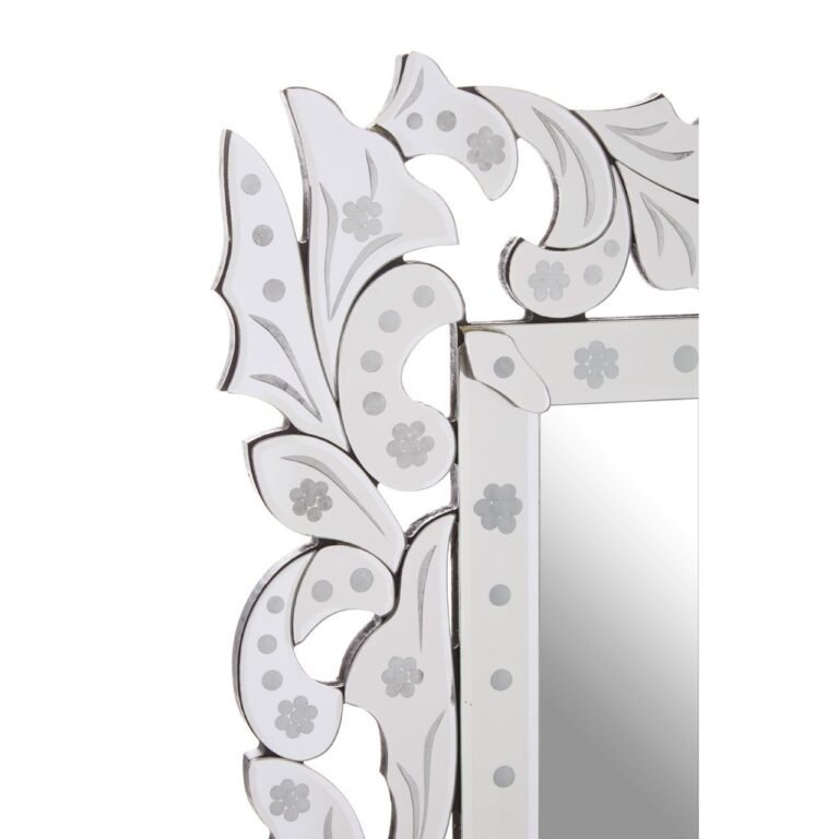 A collection of acanthus leaf motifs decorate this Eonna Wall Mirror’s rectangular frame. Classical in style, their reflective surface gives them a contemporary edge. Each piece is decorated with shaded petals and dots. These patterns also adorn the mirror’s internal frame, the latter featuring beveled corners to help refract the light.