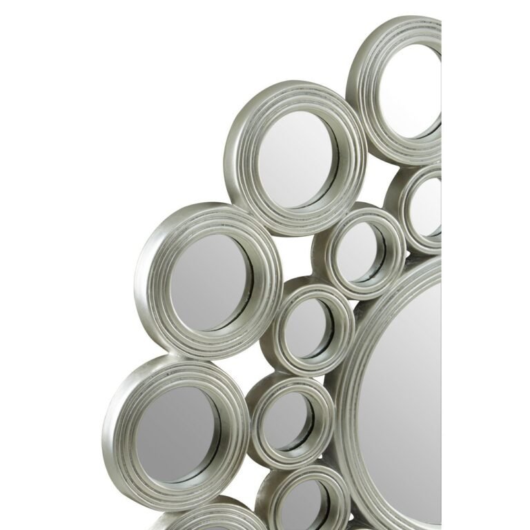 This contemporary Finsbury Silver Wall Mirror is comprised of different-sized, round metal frames joined together in a sequence like a flower. Each piece is complemented by a mirrored glass and has ridged lines that give it a texture. Suitable to add in boutique hotel style interior, it will make an eye-catching focal piece.