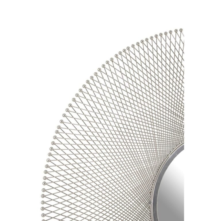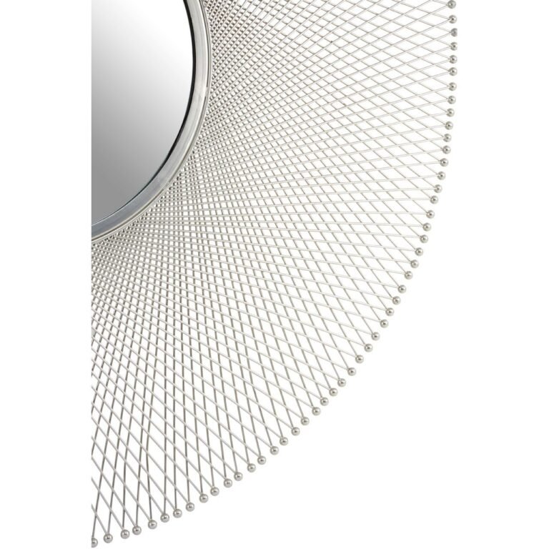 This Foxley Large Round Wall Mirror impresses with its refined and elegant frame. Made from aluminium, small nickel finish iron lines intersect each other to form a minimal criss cross pattern. Surrounding the centre mirror, the silver frame furthers the decorative flair with filigree metal struts present at each pointed end of the sleek wires.