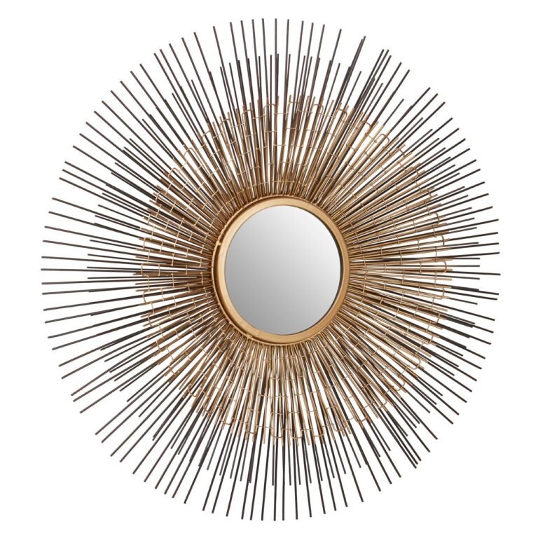 The Foxley Nickel / Bronze Finish Wall Mirror features a plethora of iron lines with alternating lengths. The bronze finish on the frame of the round mirror extends to the shards, before dissolving into a nickel colour. This transition serves to accentuate the scale of the frame. Coordinate it with boho-style lighting and accessories.