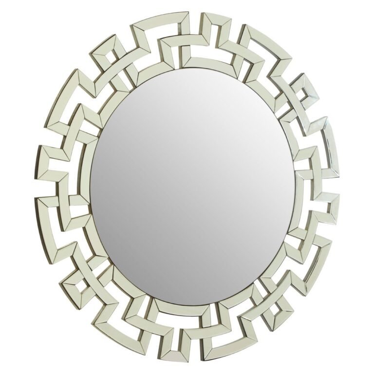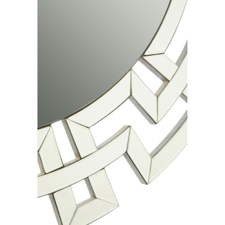 The Giz Round Wall Mirror has a clean, circular plane with edges that have subtle bevelling, helping it to refract light. An angular lattice pattern envelops the mirror, each line mirrored and beveled to enhance its reflective effect. Display this contemporary piece with metallic coloured lighting and textiles.