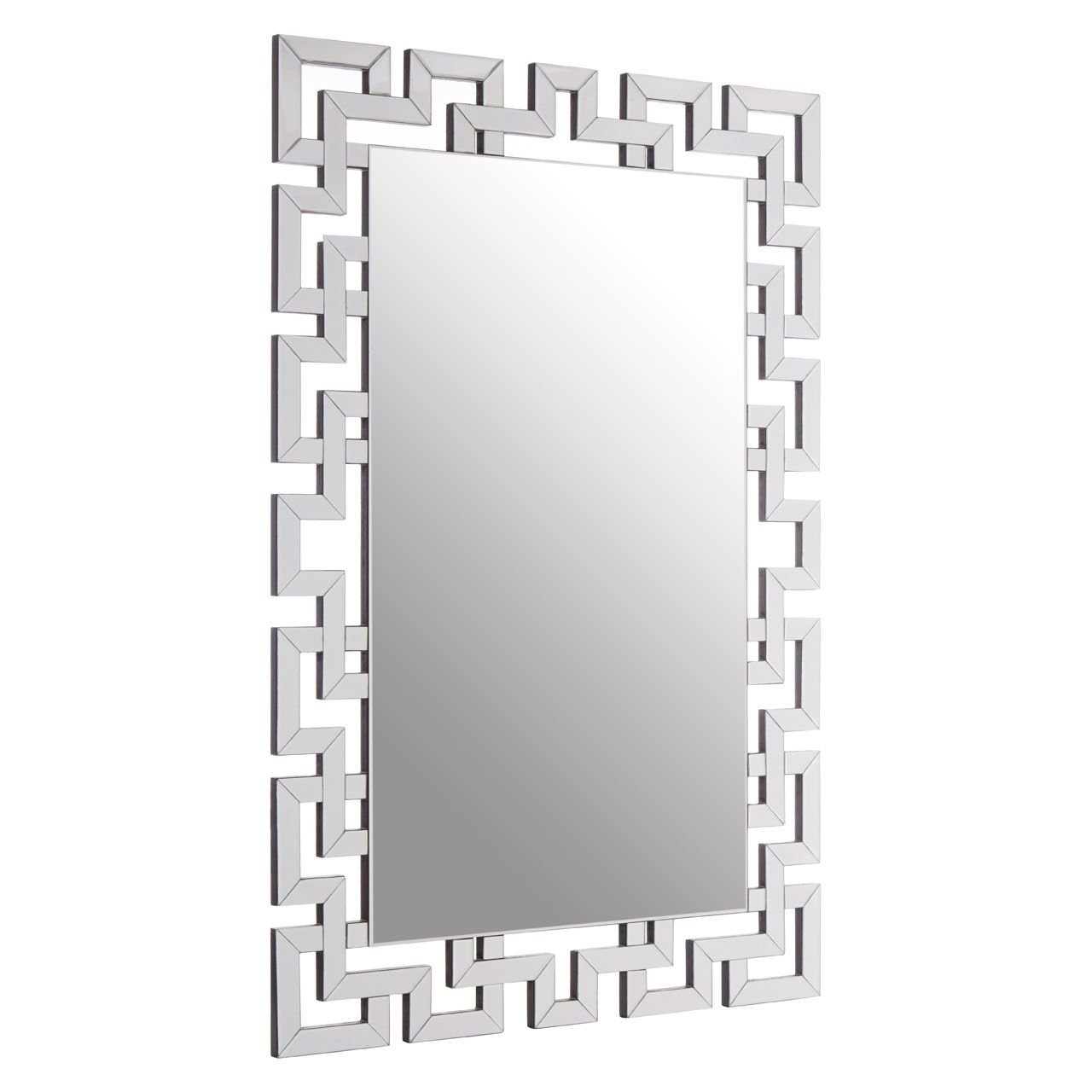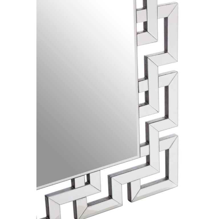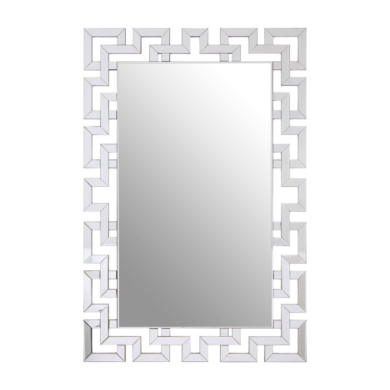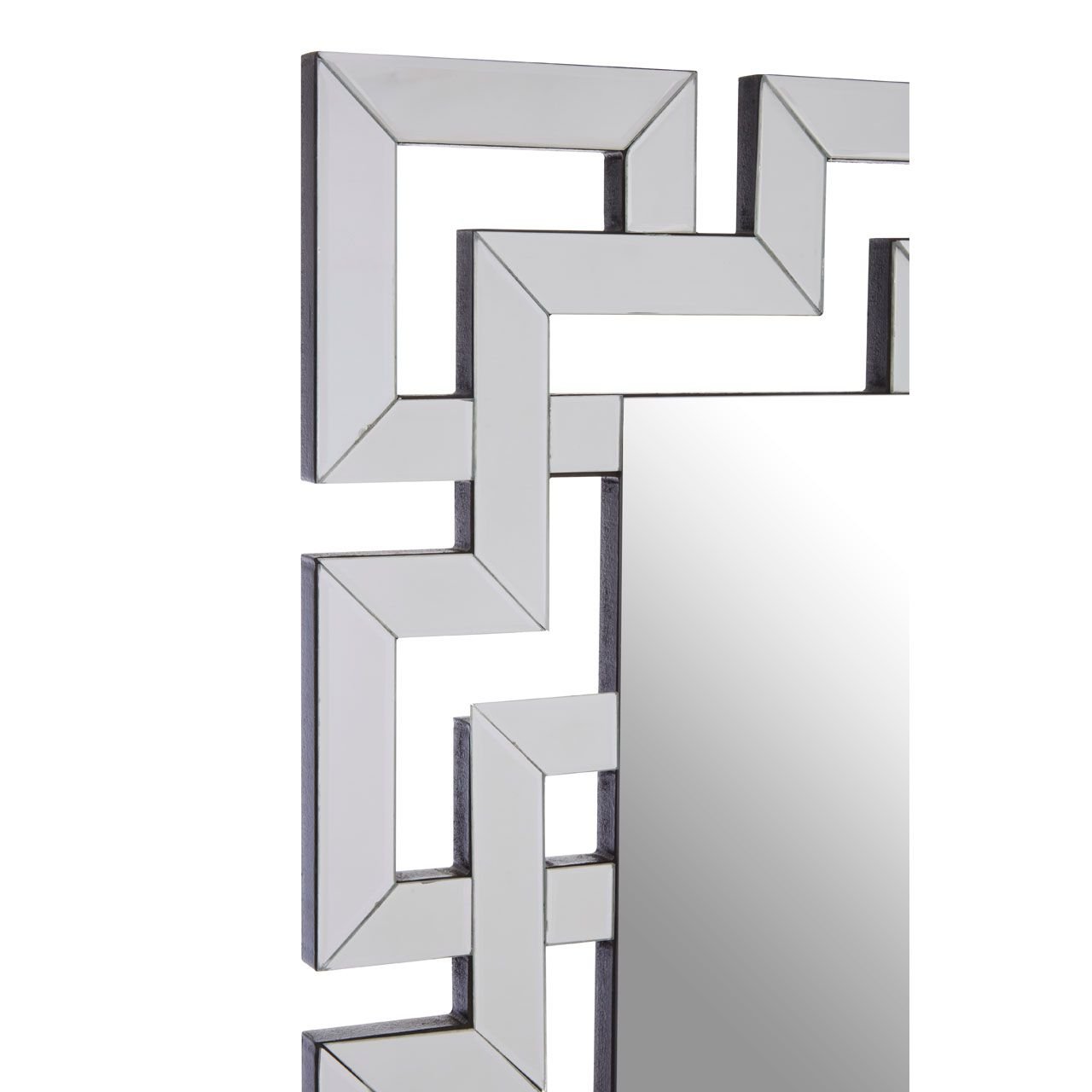 The Issy Rectangular Wall Mirror has a clean, rectangular plane with edges that have subtle beveling, helping it to refract light. An angular lattice pattern envelops the mirror, each line mirrored and bevelled to enhance its reflective effect. Display this contemporary piece with metallic coloured lighting and textiles.