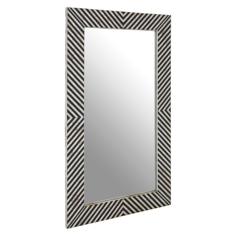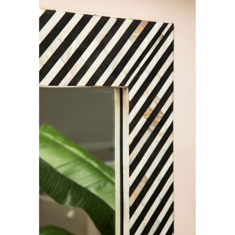 This Laniere Black And White Wall Mirror is part of a well-styled Laniere range and the Laniere Black And White Wall Mirror are no exception to the Boho vibe and style. With its monochromatic geometric zig-zag design the feel of the mirror is that of sturdiness and smooth to the touch. Elegant yet quirky as it has white bone inlay to give that different edge to the design. Enhanced by the coordinating pieces in this range the Laniere Black And White Wall Mirror will look stylish and designer in any room setting.