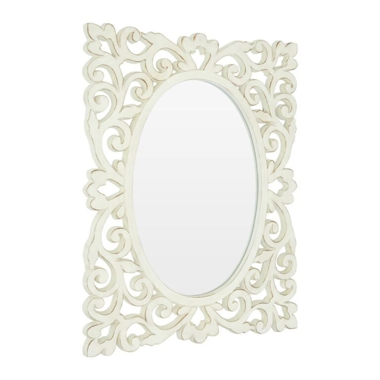 The rococo-inspired frame is finished in white, with delicate weathering around its edges that accentuates its flowing design. Laurette Wall Mirror asymmetrical arrangement lends balance and poise to this exquisite decorative statement piece. An oval border separates the frame from the reflective surface. Display it with boutique hotel furniture and lighting.