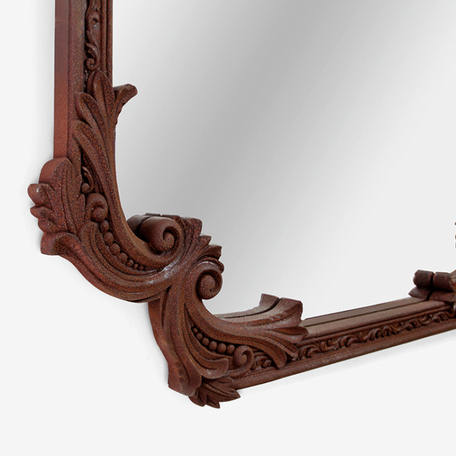 Hand carved details on the mahogony mirror frame, with a textured oxidized finish.