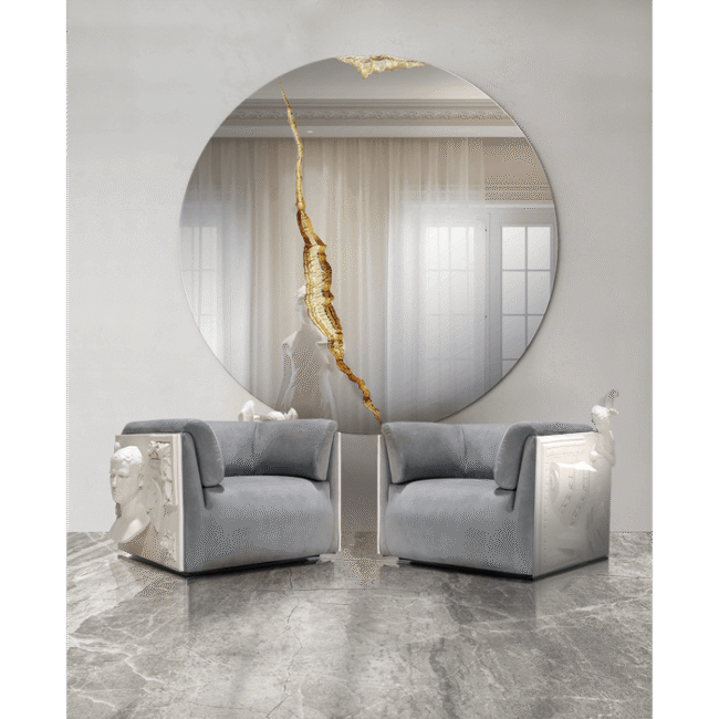 The large round sculpture in polished stainless steel portrays a perfect mirror, and it is ripped by a hammered polished brass sheet. A hidden LED lighting strip bursts around the whole body for warm light and timeless luxury. A masterpiece for statement walls and world-class interiors.