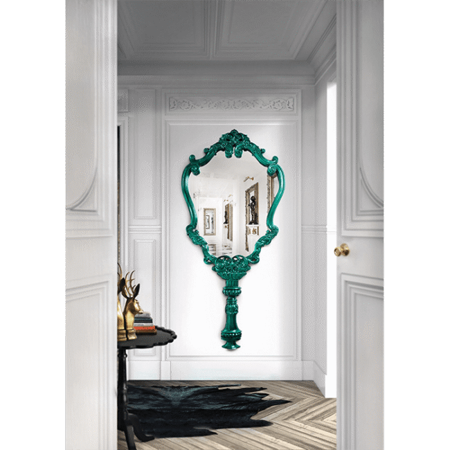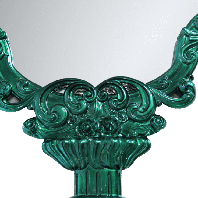 Hand carved details on the mahogony mirror frame, with a high gloss electric finish.