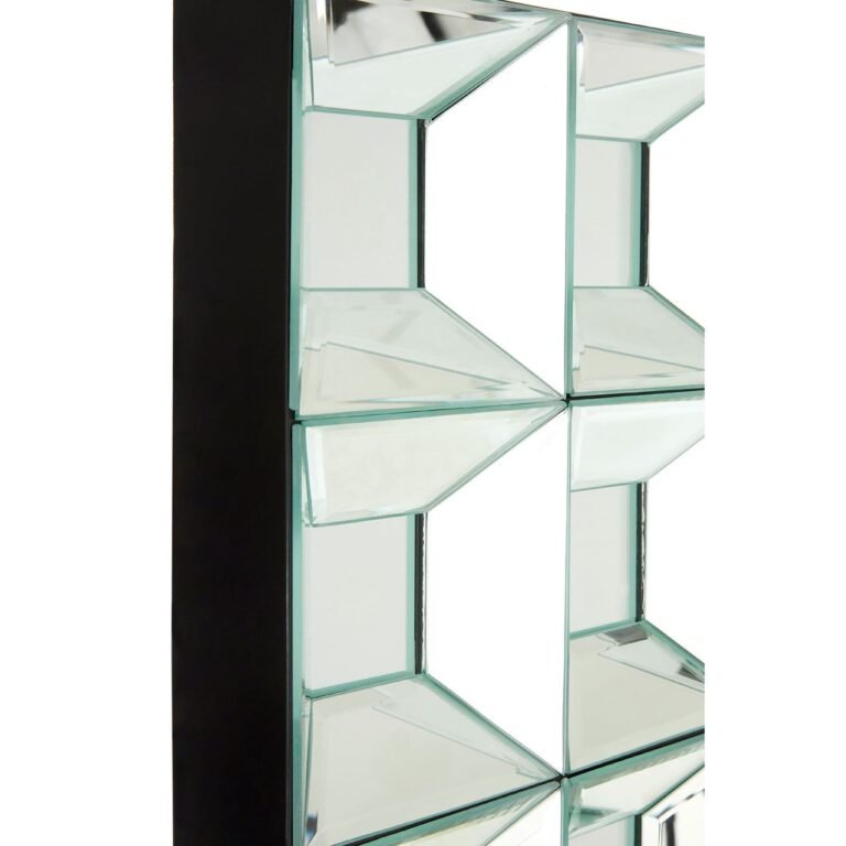 When viewed face-on its thick black Multi Elm Glass Bevelled Wall Mirror is unobservable, giving centre stage to the distinctive reflective surface. A total of twenty four squares are covered in mirrored glass with bevelled edging to refract the light. The squares combine to geometric effect, making it a worthy statement piece for contemporary interiors.