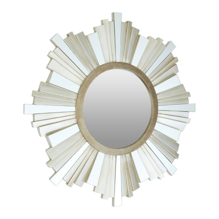This Oriel Wall Mirror is a contrast of metallic tones and reflective glass. It styles well with silver and gold toned accessories and lighting. The champagne coloured strip that borders the central mirror complements the nickel toned and glass shards, their uneven configuration producing a fragmented look.