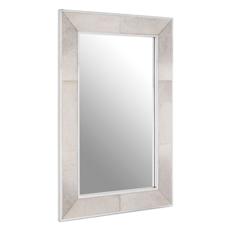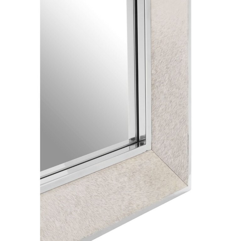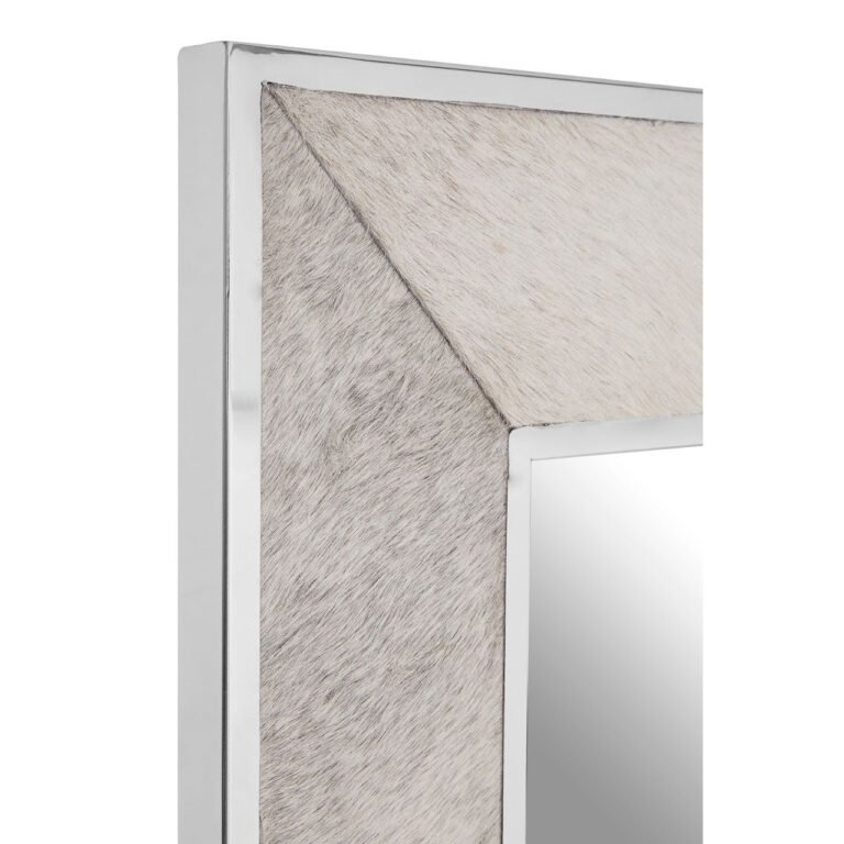 The real-hair-on-leather that covers the frame lends texture to this Regents Townhouse Small Grey Wall Mirror, while its natural colour gives it an understated yet sophisticated aesthetic. Stitching divides the leather to create panel formations. The leather is bordered by slim strips of metal with a polished finish that complements the mirror’s reflective surface. Its rectangular shape allows it to be hung landscape or portrait.