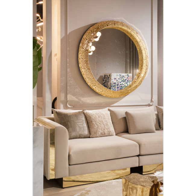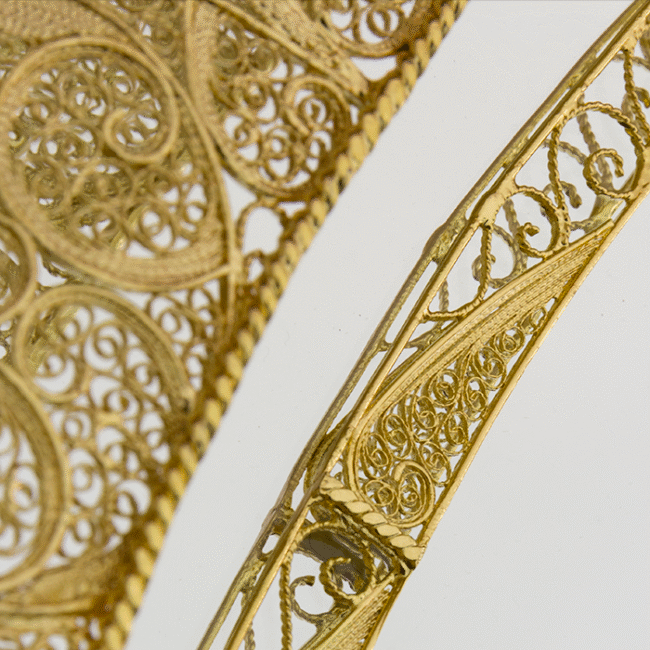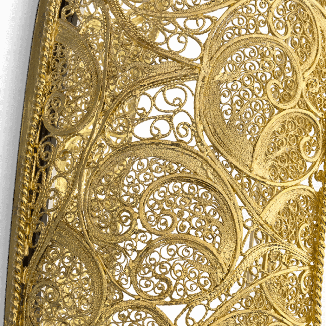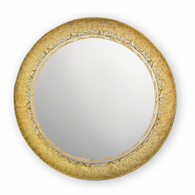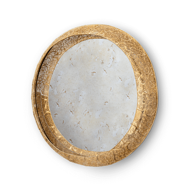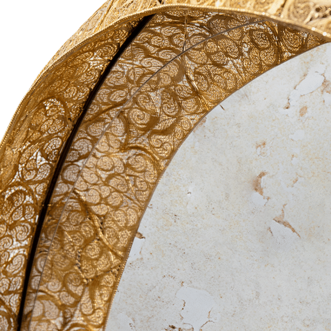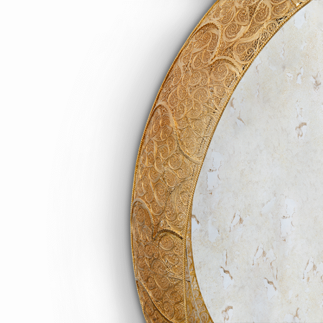 The Filigree Ring mirror resorts to one of the oldest jewellery making techniques known. Completely handcrafted, with each brass cord fitted with precision, the Filigree Ring flourishes in a traditional homage to Portuguese culture and commitment, like a jewel that reflects eternal beauty when it is contemplated. The large wall mirror’s edge is made of brass cords gilded in 18k gold, conceiving an exquisite gold round frame which elevates any setting into world-class interiors. The richness of Filigree Ring lies within its detailed jewelry expression in which skilled artisans painstakingly solder tiny beads and twisted threads to create striking artistic motifs. A precious piece of art that pays tribute to the finest craftsmanship, ideal for a unique and exclusive home.