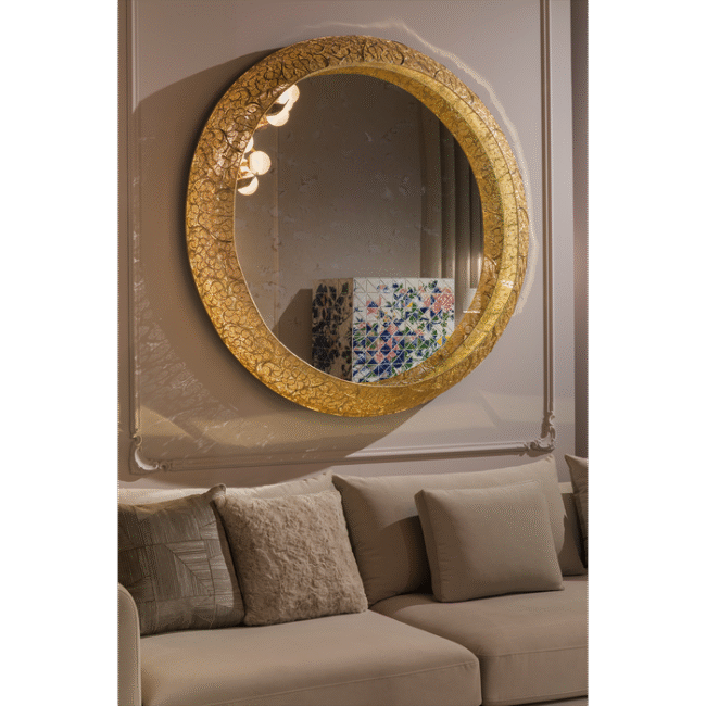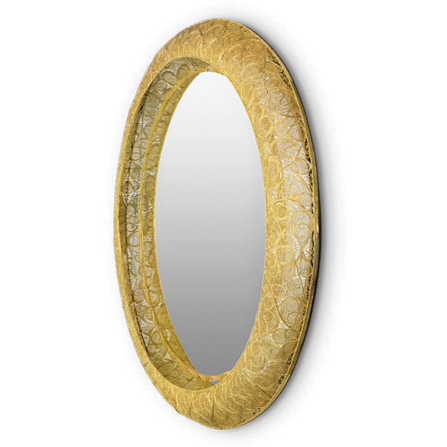 The Filigree mirror’s structure is made from brass cords, gilded in 18k gold.