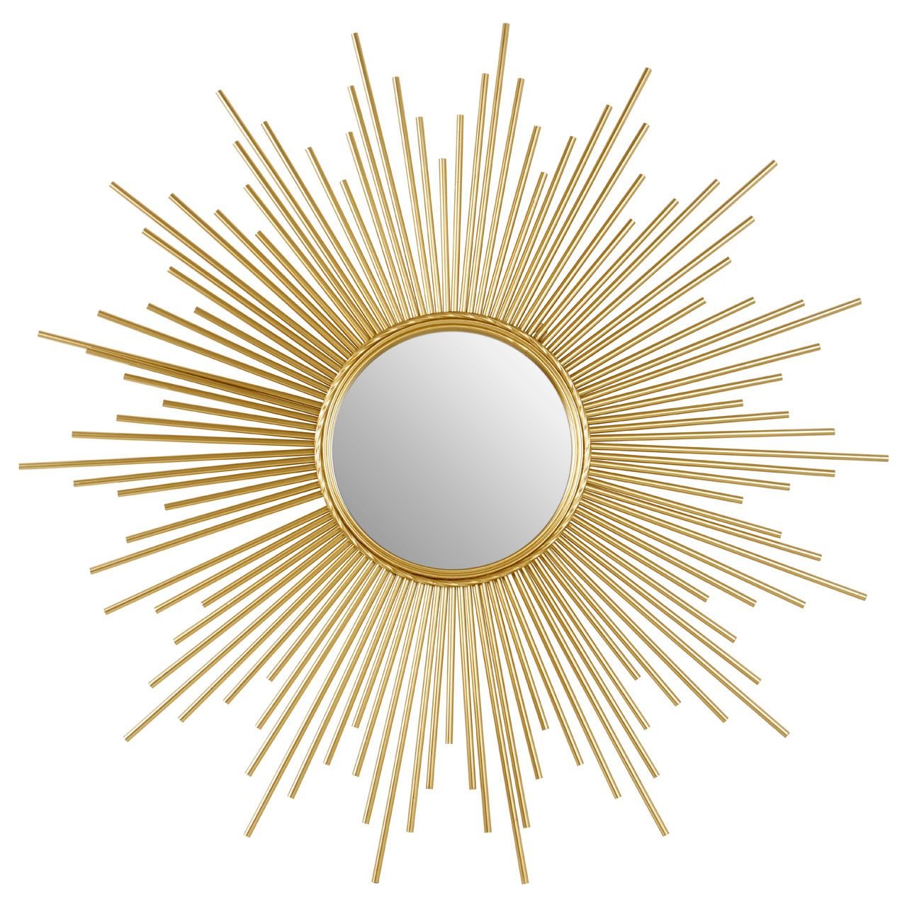 The Taristal Gold Finish Wall Mirror frame is composed of a collection of slim iron rods, configured to create an eye-catching sunburst design. Each one has a warm gold finish. The convex mirror brings a panoramic element to the design.