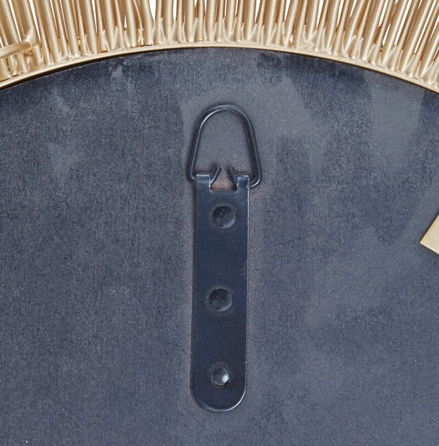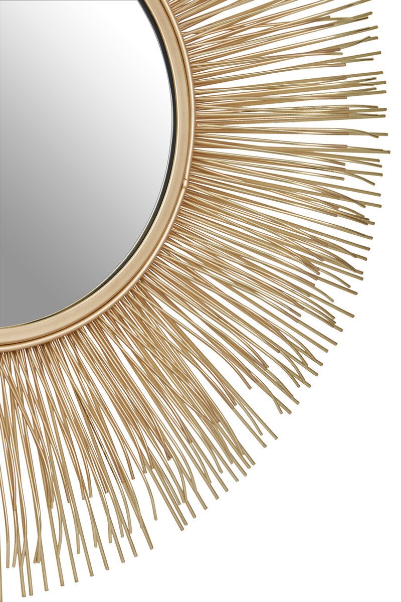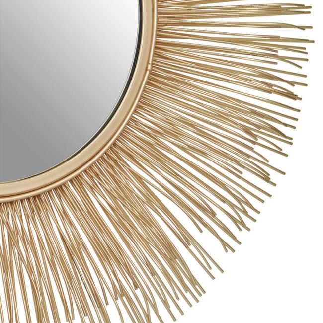 The Templaire Gold Finish Sunburst Wall Mirror features a brass finish iron frame with sleek iron rods emerging from it, adding a spoke like detail and texture.
