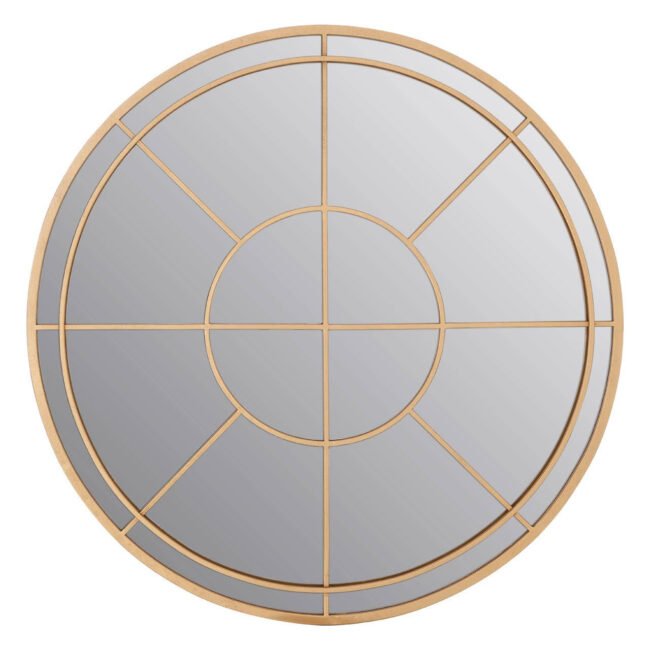 The Aulie wall mirror features a sturdy metal wireframe in a gold finish that encases the mirrored glass. The intricate crosshair style creates a striking visual appeal, making the design ideal for luxe interiors.