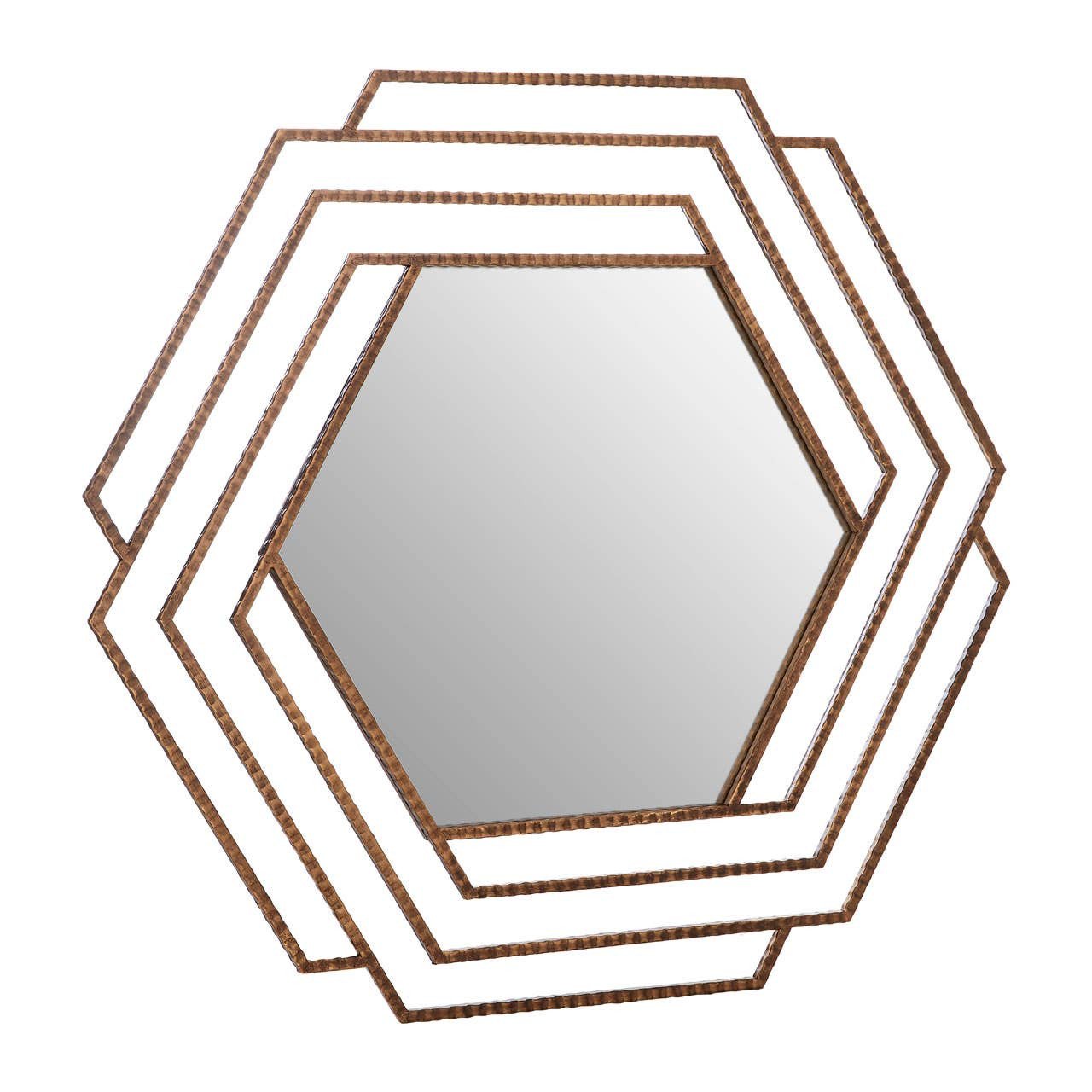 This wall mirror features a textured and sturdy metal frame in an antique gold finish. The layered hexagonal design contributes to its stylish aesthetic and makes it a distinctive geometric accent piece.