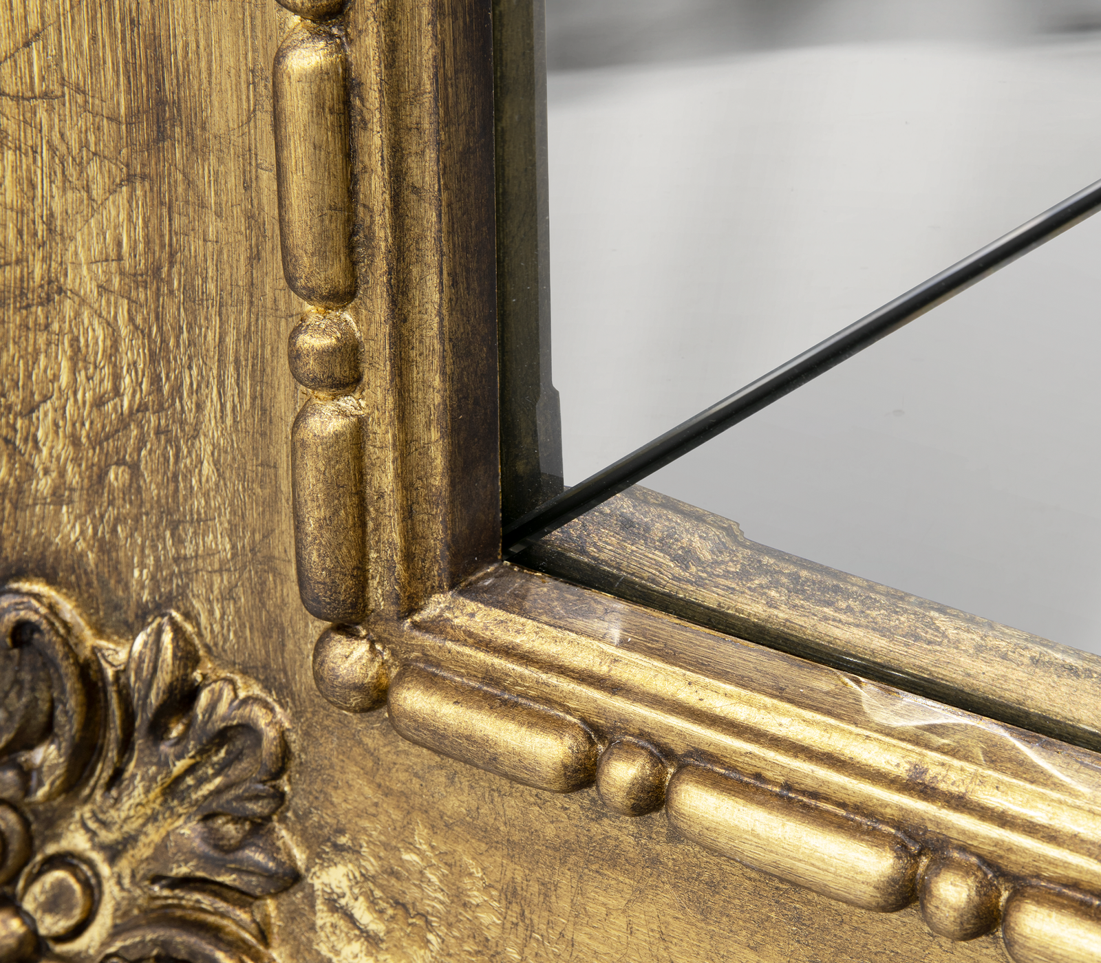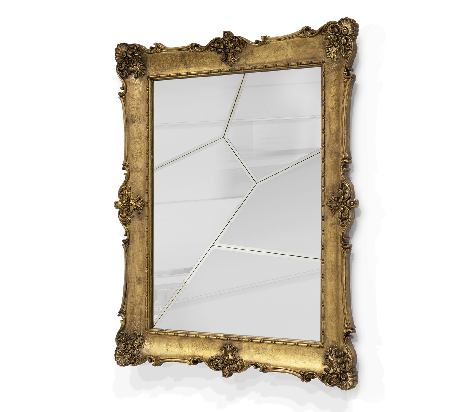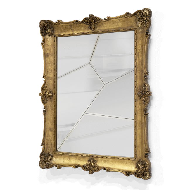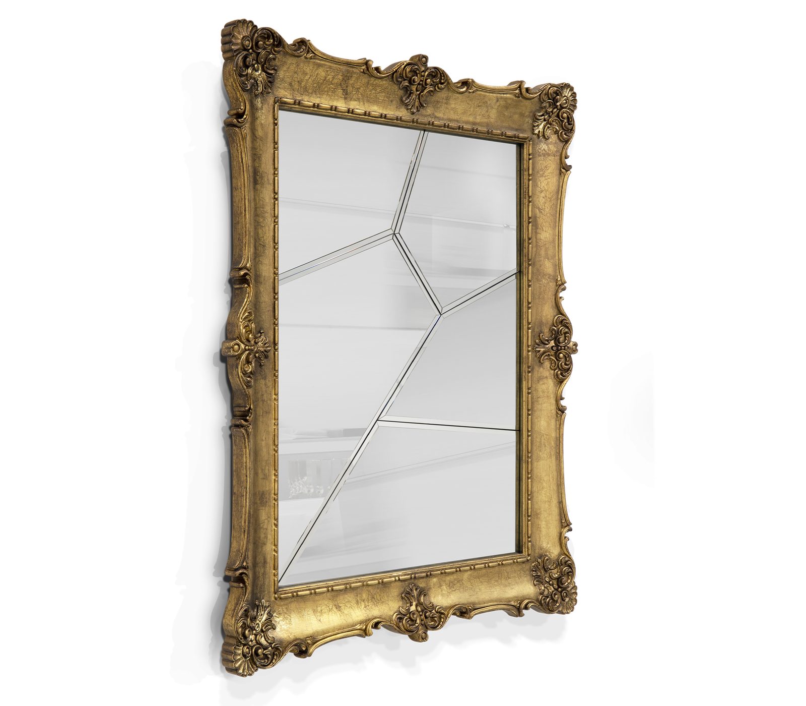 The D.Dinis luxury big mirror embodies the classic Parisian style in its golden detailed frame while capturing glimpses of irreverent and modern features on the surface. Fragmented mirrors burst for unexpected juxtaposition.