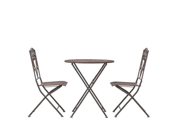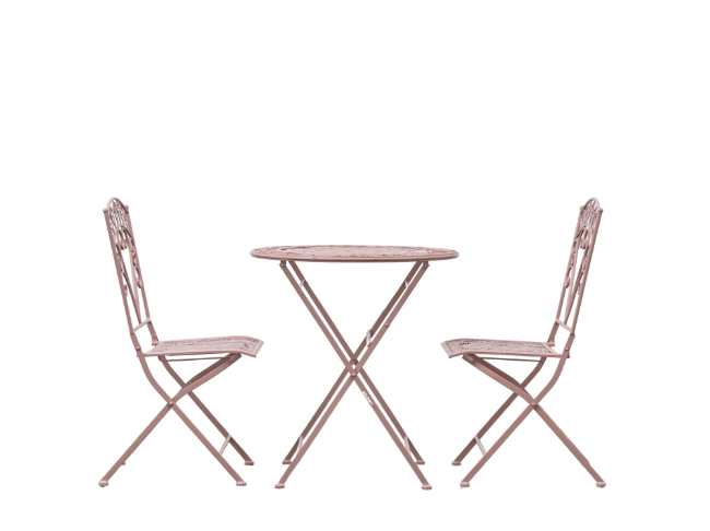 Ideal for balconies, smaller outdoor spaces and cosy garden corners, this lovely set offers a bistro cafe style. Crafted from metal in an unusual lovely pink finish, the design is inspired by nature, with the pattern on the table top and chair seats evocative of leaves and trees. The table and chairs fold for easy storage when not in use. It is also available in a deep metal patina finish.