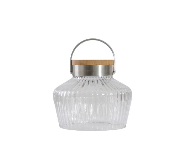 Give a little glow and ambience to your outside space this summer. Thanks to the aluminium handle, this lamp is easy to position wherever you need it. The ridged glass lamp is powered by a solar panels embedded in the teak wood top. With 3 light intensity settings, the lamp can run for up to 5 hours on the brightest setting, up to 8 hours on the middle setting, and up to 12 hours on the lowest setting, after charging by direct sunlight. It can also be charged by USB (charger not included), which gives up to 32 hours of light on the brightest setting, and up to 60 hours on the lowest. Coordinating smaller lamp available.